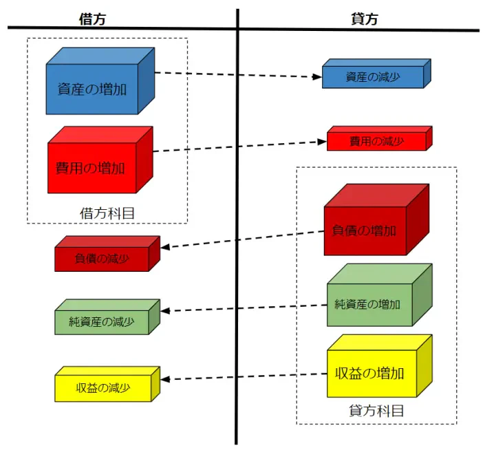 借方科目が貸方に置かれたときは借方科目の減少を意味し、貸方科目が借方に置かれたときは貸方科目の減少を意味します。このルールを暗記してしまえば、簡単に分類できるようになります。