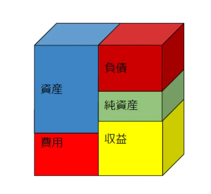 これらの5つの箱は貸借対照表と損益計算書の要素を分解したものです。一つ一つの箱は複数の勘定科目で構成されています。5つの箱を下図のように合体させると、右側と左側の高さが同じになります。
