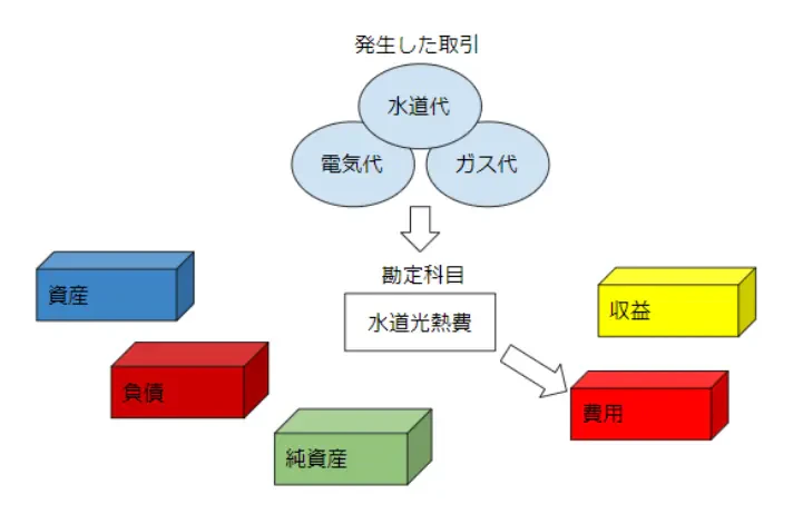仕訳は、取引の内容ごとに勘定科目を使って記録する技術です。仕訳と勘定科目は一体になって機能します。勘定科目は「資産」「負債」「純資産」「収益」「費用」の5つ箱のどれかに分類されます。
