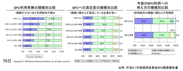 また、「平成21年度経済産業省BPO調査報告書」によると、中小企業におけるアウトソーシング利用割合が大企業に比べると低いことがわかります。しかし、中小企業のアウトソーシング利用に対する満足度は大企業と同等程度の高い水準にあります。中小企業はアウトソーシングを利用するとその良さに気づきますが、実態の利用は少ない状態です。