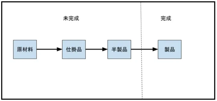 以下の図は、原材料が完成に至るまでの製造工程を表しています。