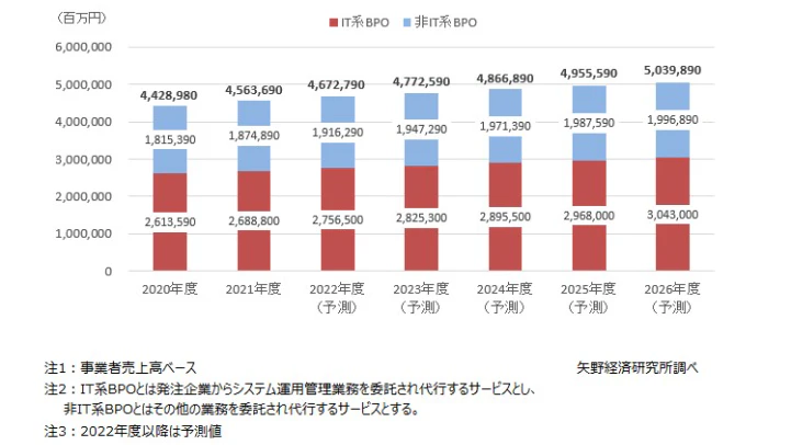 2021年度のBPOサービス市場規模はIT系BPOと非IT系BPOの合算値で前年度比3.0%増の4兆5,636億9,000万円に登ると推計されました。この増加傾向は2026年までも続く見通しで、オンライン秘書やBPOなどのアウトソーシングサービスは今後よりビジネスに浸透していくものになっていくでしょう。