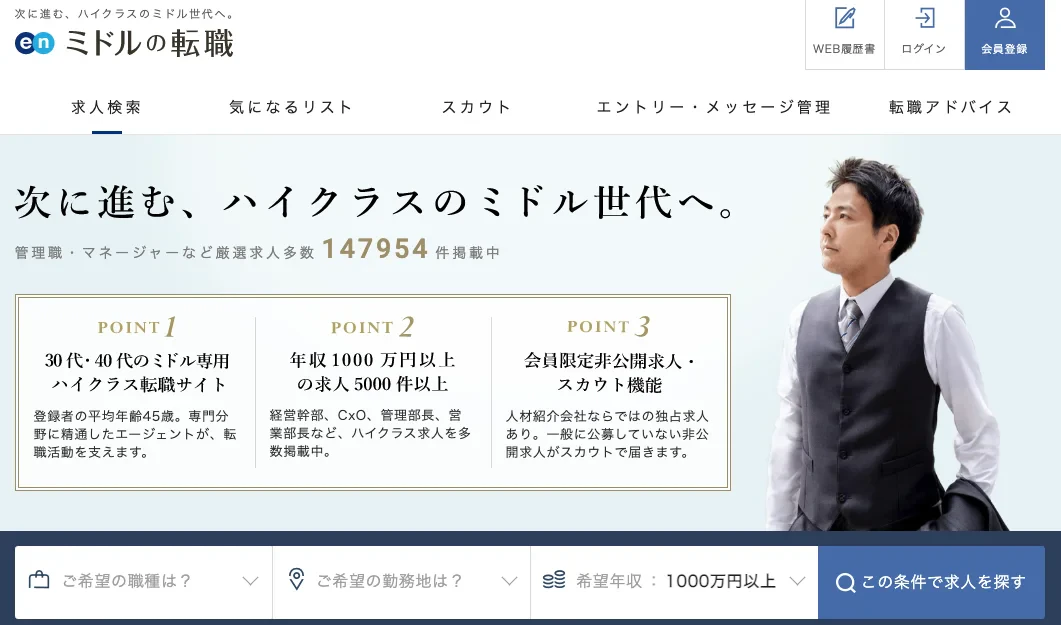 ミドルの転職は、経営企画や管理部門、ハイキャリア層向けに特化した求人が充実しており、ミドル層の方に適した転職エージェントとなっています。