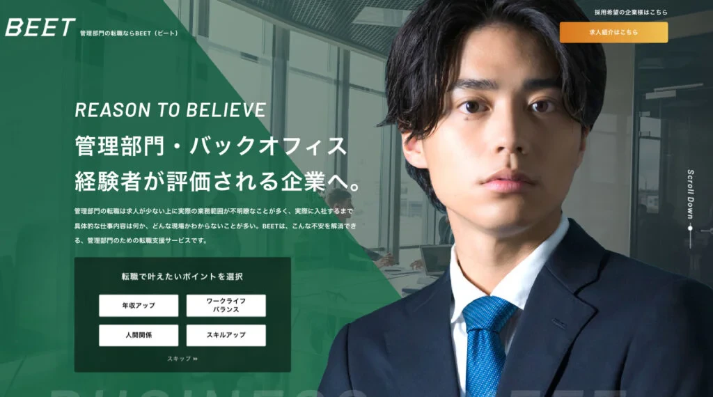 BEET AGENTはエンタープライズ企業やIPO準備中の求人案件を多数保有し、企業の管理部門に特化した転職エージェントです。