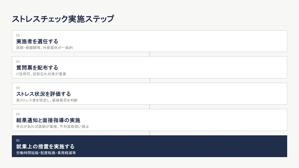 ストレスチェックは年1回以上の実施が義務付けられており、医師等による実施体制の確保と並んで本人への結果通知、高ストレス者から申出があった場合の医師面接指導、集団分析(集団分析はあくまで努力義務)等が実施手順となります。