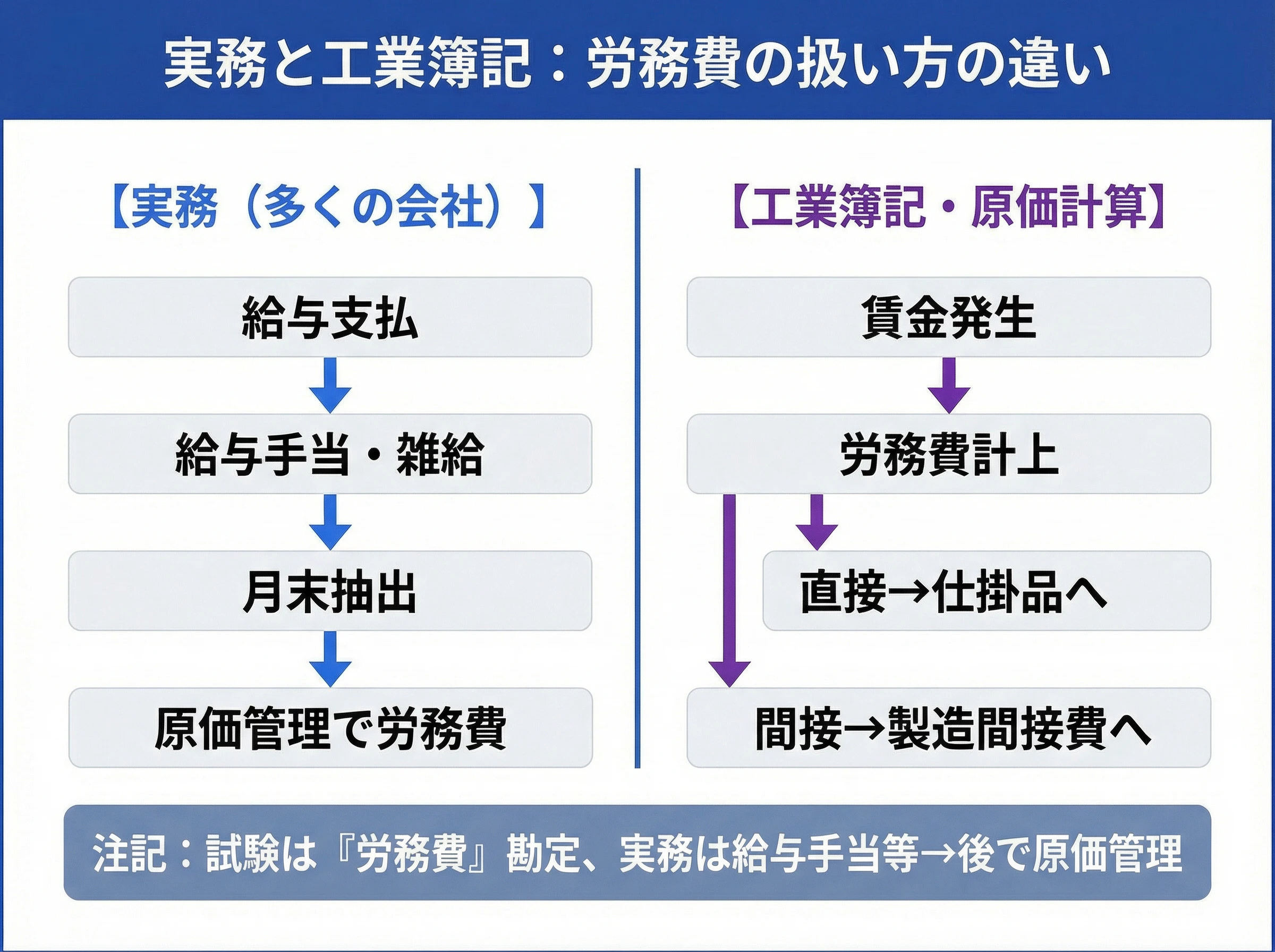 ここまでは、実務での帳簿処理を中心に見てきました。一方、簿記試験や原価計算の考え方では、「労務費」はもう少しはっきりした位置付けになります。