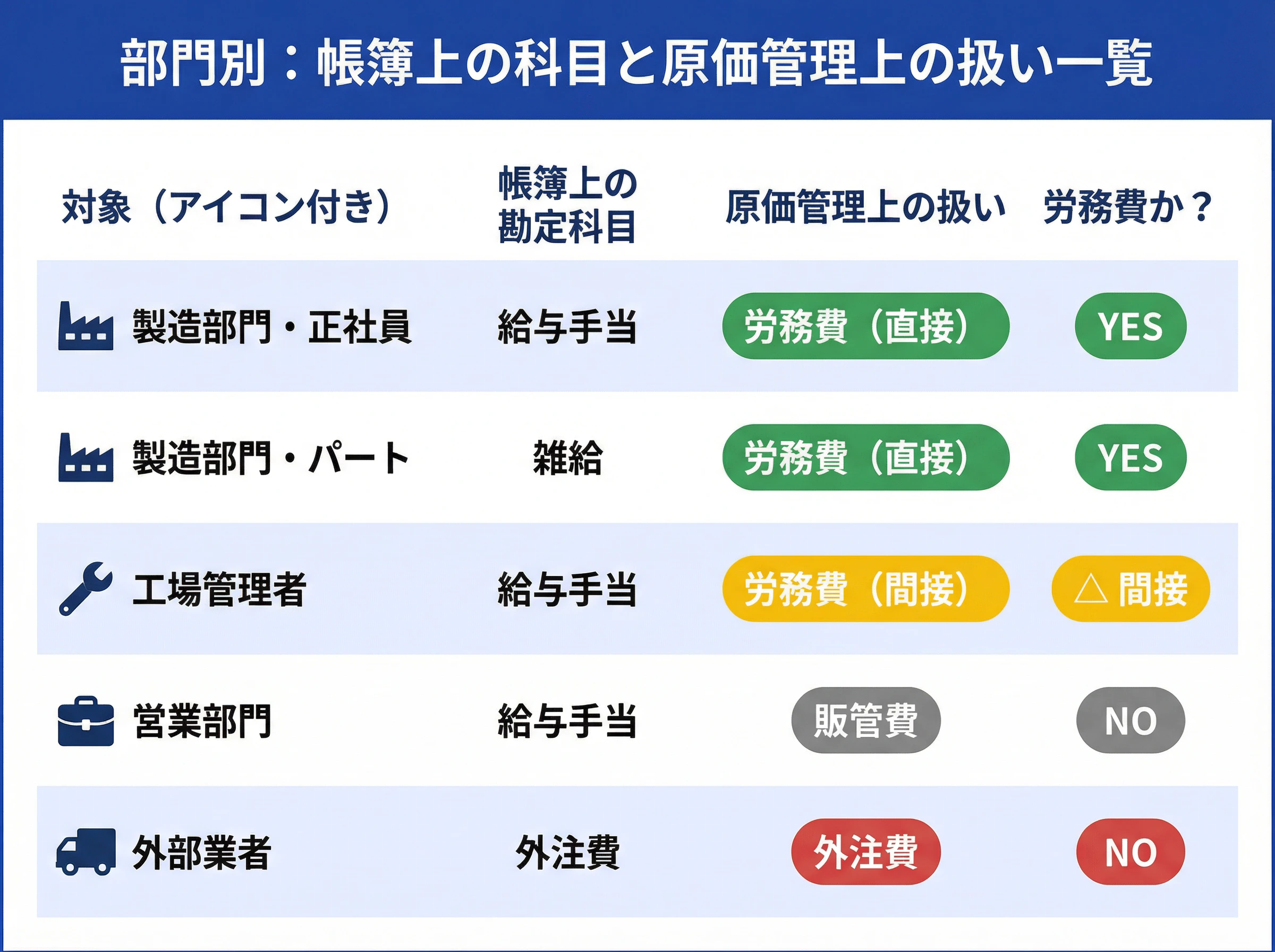 製造部門の正社員給与 | 給与手当 | 扱うことが多い | 帳簿上は給与手当で処理し、部門別集計で労務費として見ることが多いです。 |