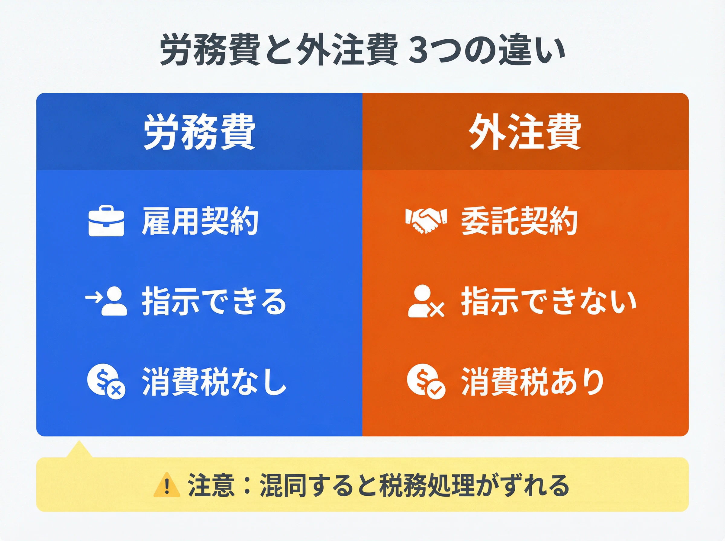 労務費と外注費は、どちらも人が動くことで発生する費用に見えますが、実務では同じではありません。特に違いが大きいのが、契約形態・指揮命令・消費税の3点です。