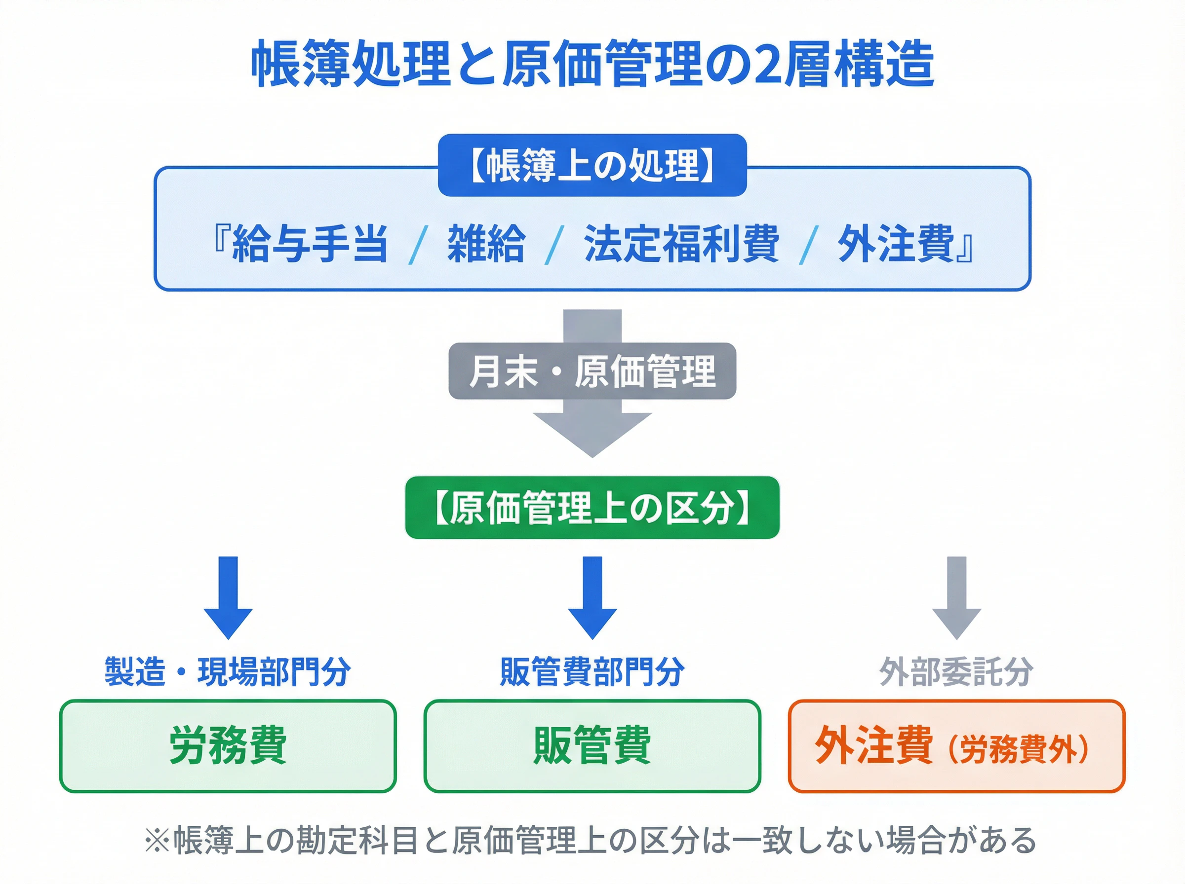 ここがいちばん混乱しやすいところですが、帳簿上の勘定科目と、原価管理上の区分は同じとは限りません。