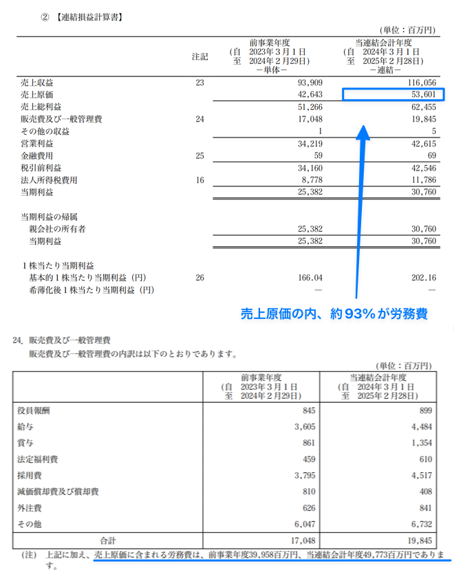 実際にベイカレント・コンサルティングの2025年2月期の有価証券報告書を見ると、売上原価536億円のうち労務費は497億円と、約93%を占めています。材料費や設備費がほぼ発生しないコンサルビジネスの原価構造が、数字にそのまま表れています。