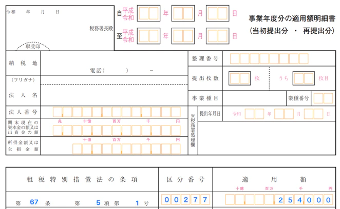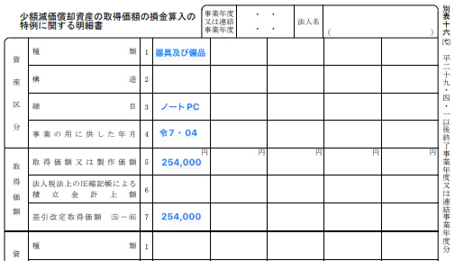 (法人)少額減価償却資産の取得価額に関する明細書(別表十六(七)「少額減価償却資産の取得価額の損金算入の特例に関する明細書」)、および所定事項を記載した「適用額明細書」を添付する
