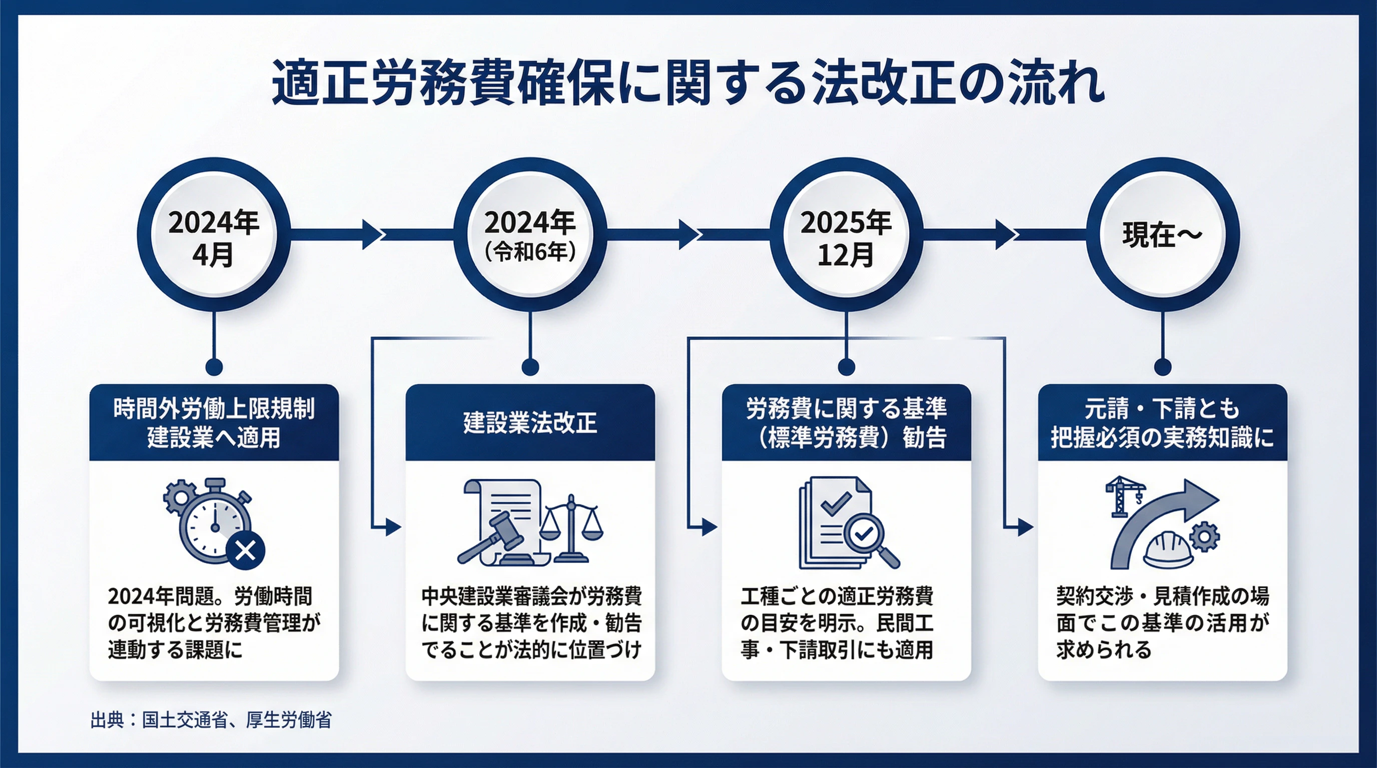 人手不足による構造的な労務費上昇に加え、2023年4月からの時間外割増賃金の引き上げ(60時間超は50%以上)も建設業の負担増に直結しています。こうした環境下で、工事ごとの正確な労務費管理は利益確保と見積もり精度の両面で重要性を増しています。