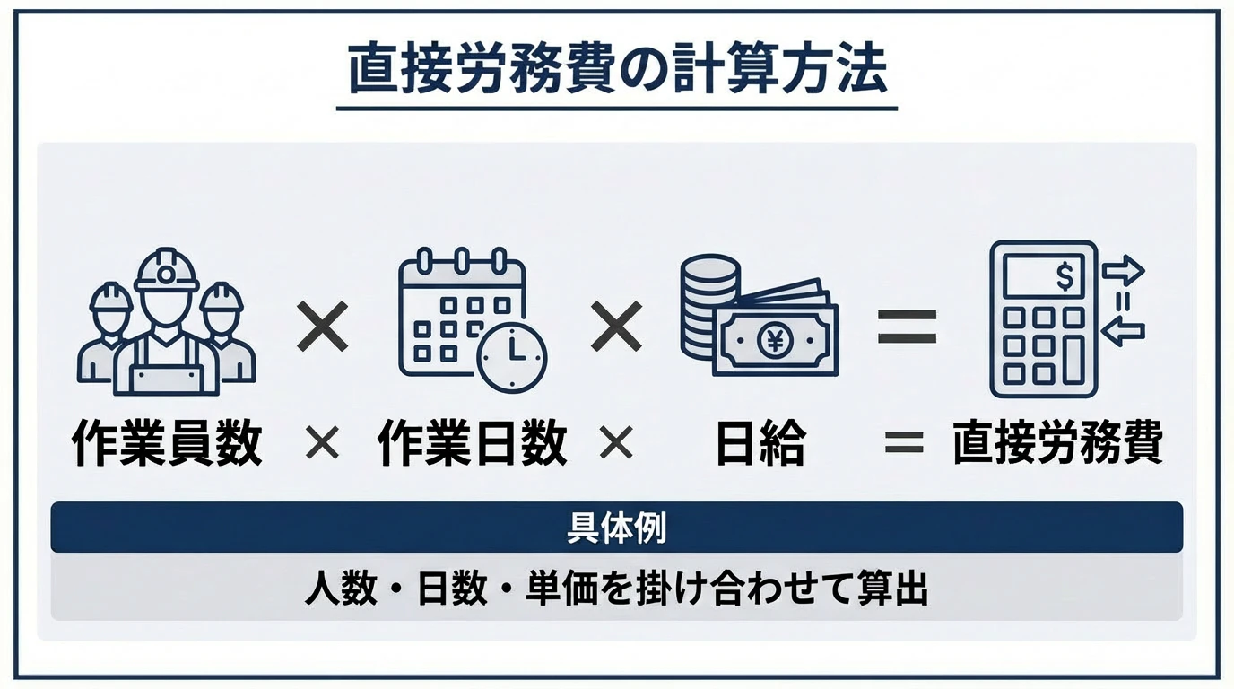 基本は「誰がどの工事にどれだけ従事したか」の記録です。直接労務費は以下の計算式で算出します。