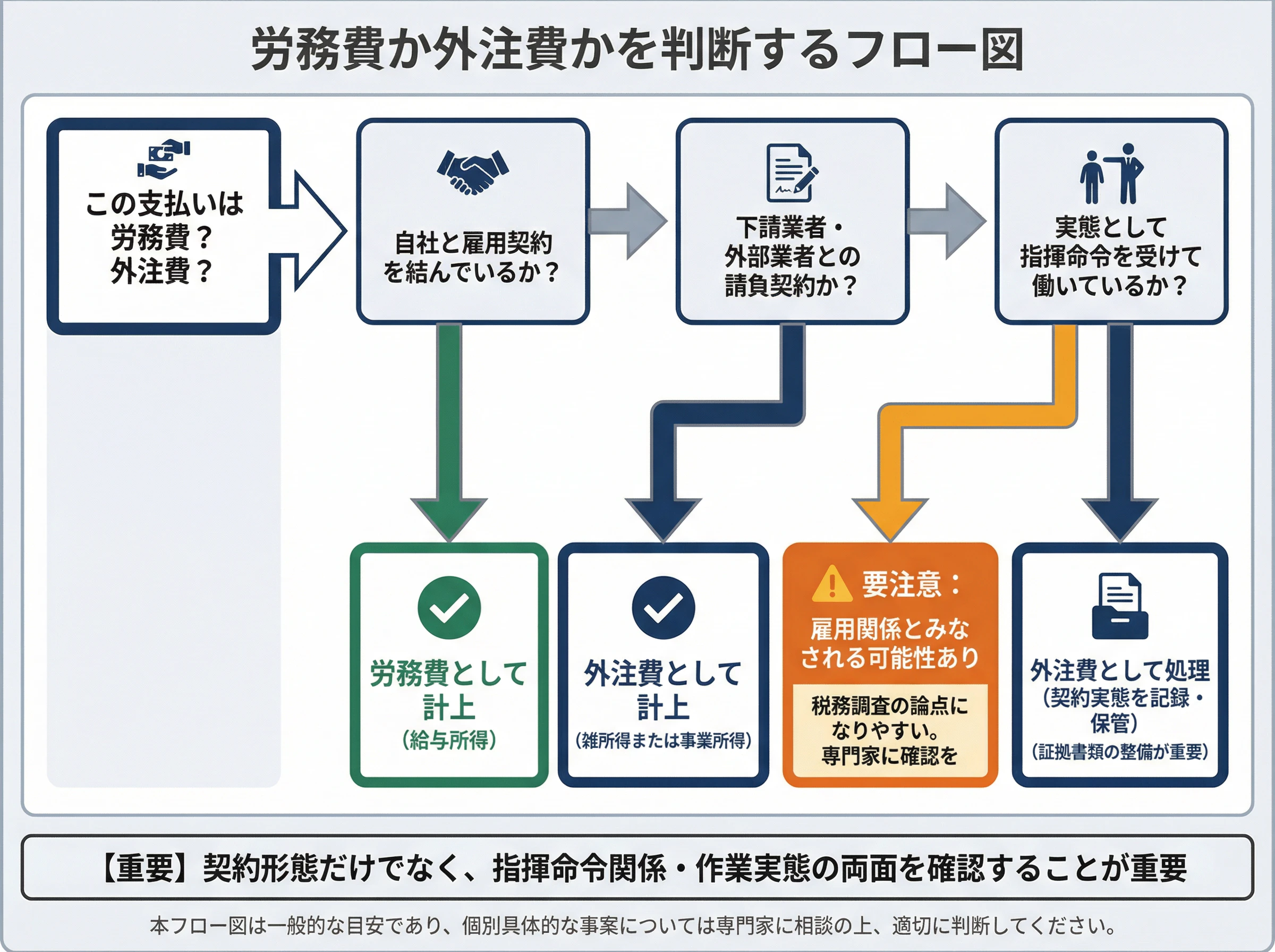 このケースは実務上判断が分かれやすい論点です。会社によっては「労務外注費」として管理することがありますが、会計上の区分は契約形態・実態・社内基準・発注者ルールによって確認が必要です。一般論として断定しにくい領域のため、自社の処理方針を明確にしたうえで継続適用することが重要です。