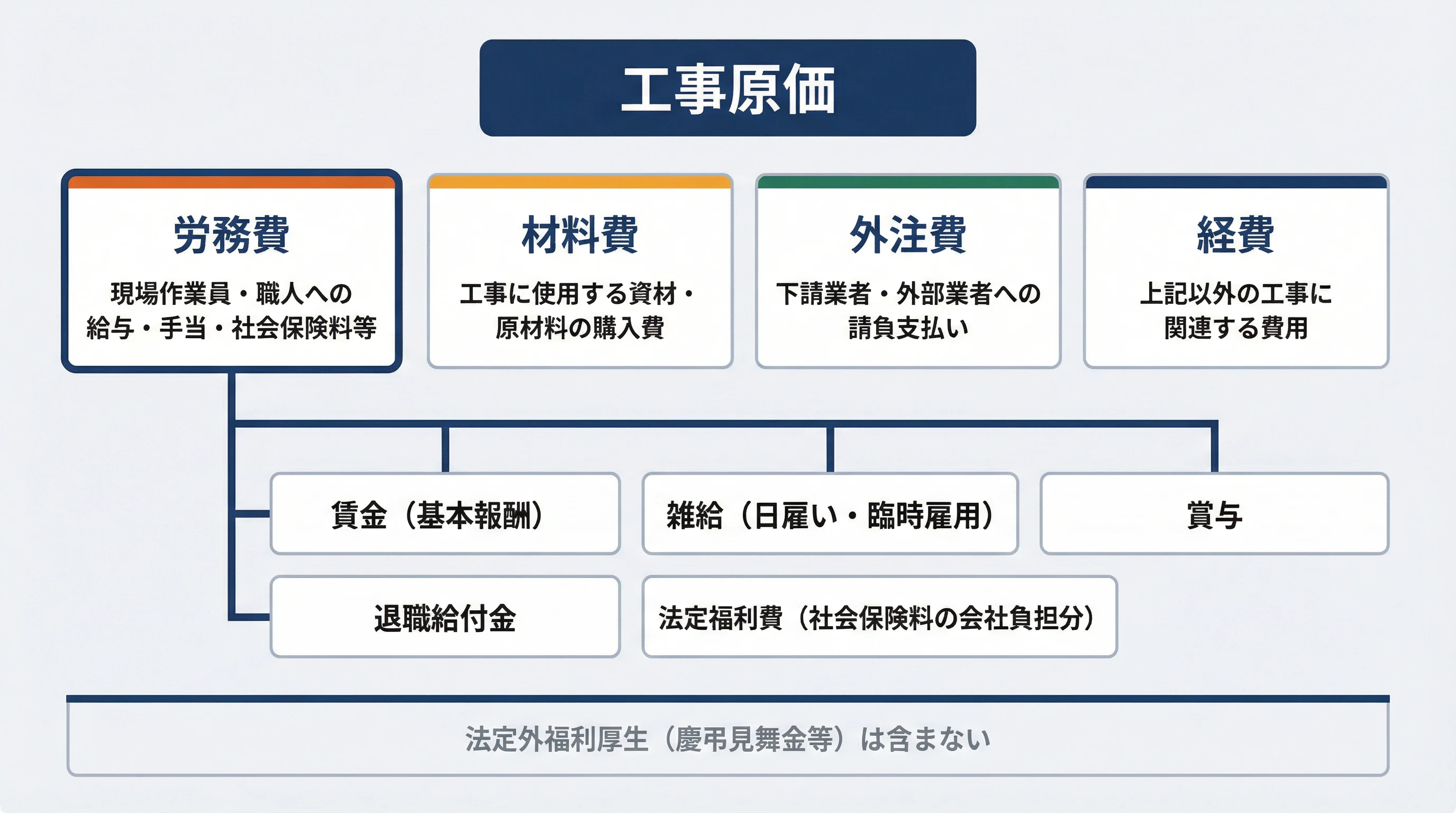 工事の直接施工に従事する作業員の賃金・給料・手当、賞与、退職給付費用、法定福利費(現場作業員に対応する社会保険料の会社負担分)などが該当します。