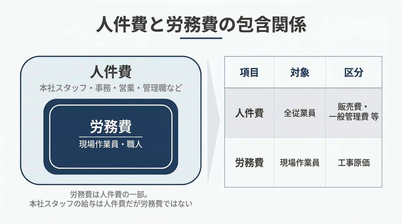 人件費は会社全体の従業員コストを指す広い概念です。労務費はそのうち工事に直接関わる部分のみを切り出したもので、製造原価に算入されます。