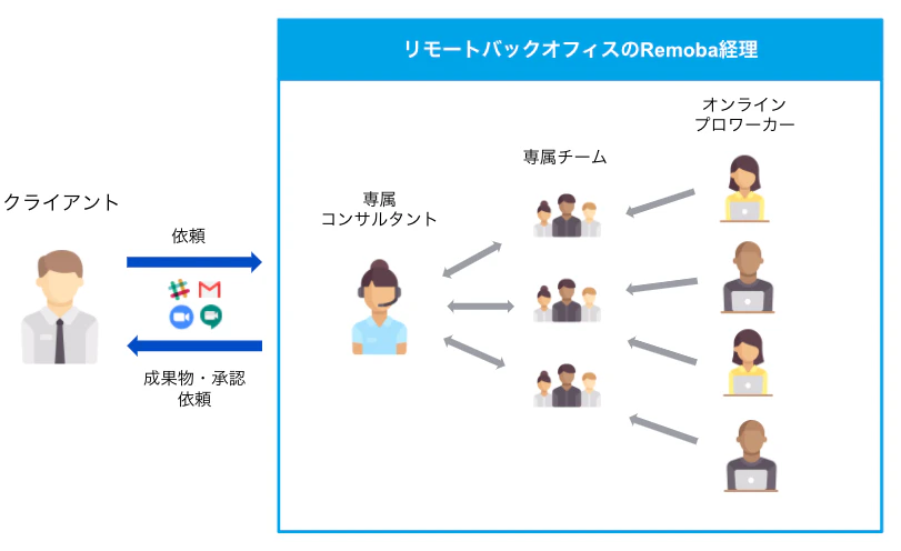 リモート・オンラインで専属のコンサルタントとオンラインブロワーカーが「売上管理」、「支払管理」、「経費管理」、「月次管理」など、数百項目の経理業務の効率化と事務作業までをまるっと請け負い、経営の意思決定やビジネスの成長をすばやくサポート致します。