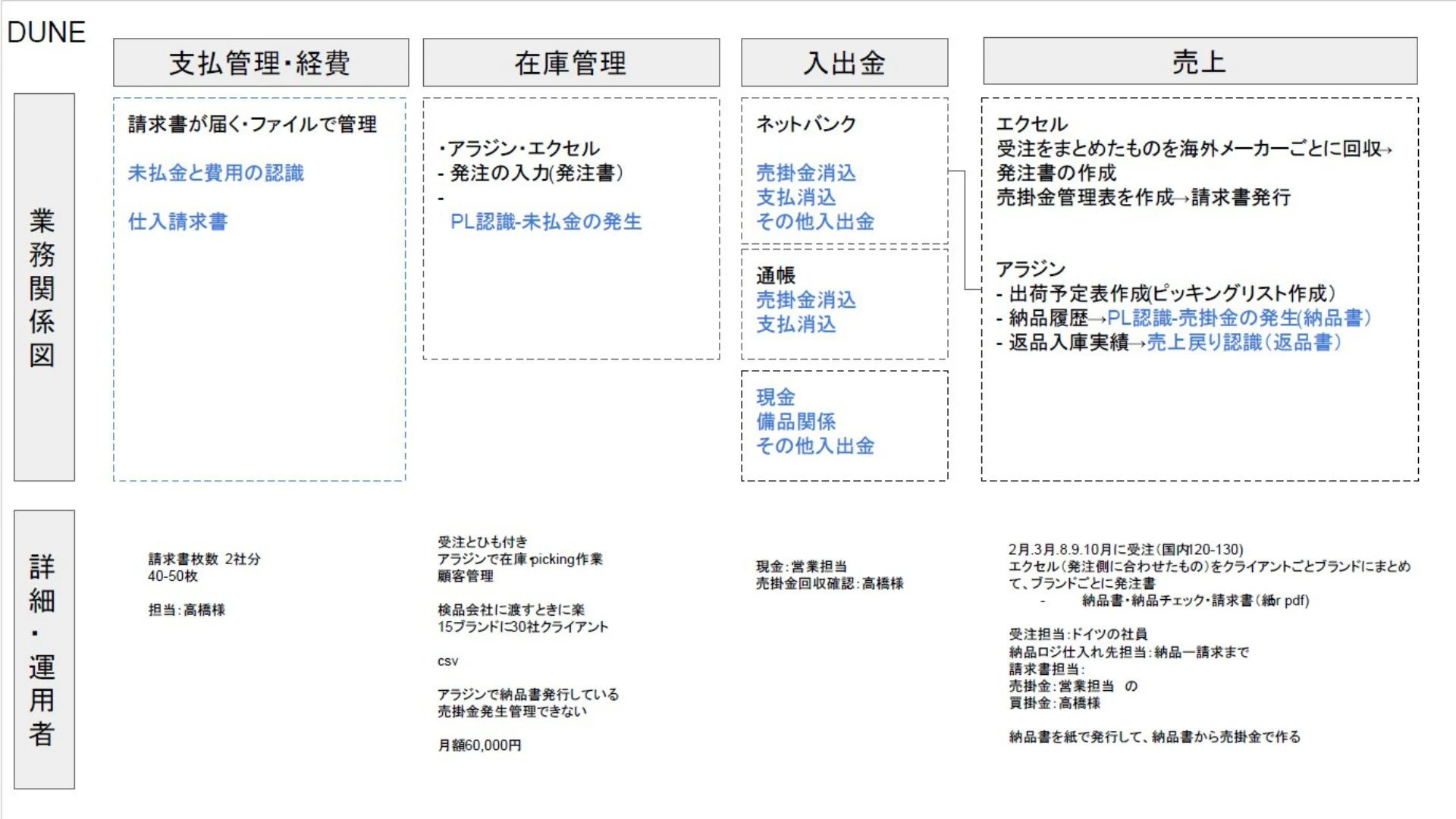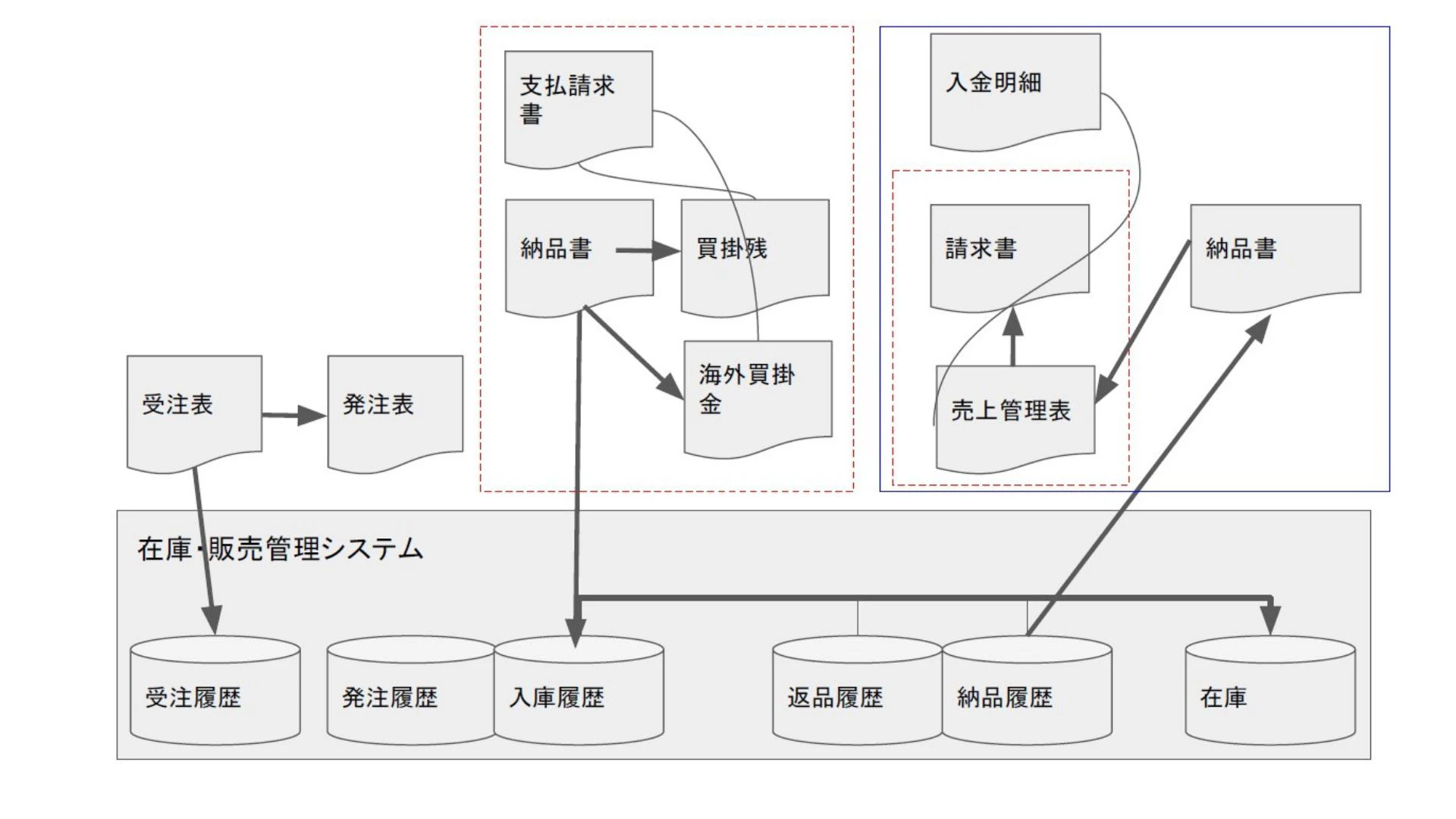 調査結果をもとに、輸入・販売・在庫・会計までのデータの流れを図式化し、ボトルネックを特定しました。
