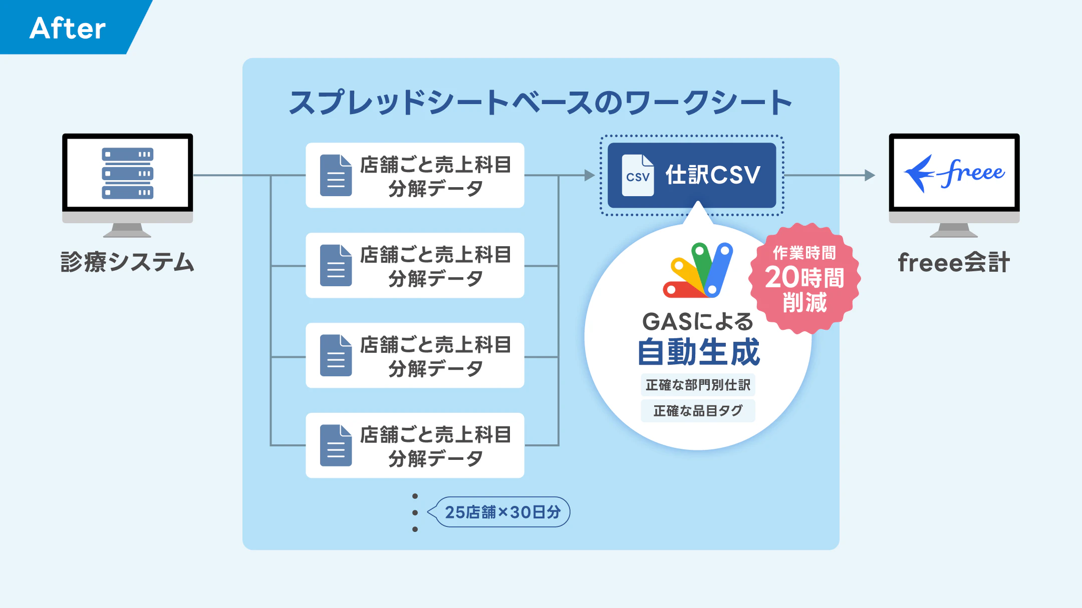 基幹システムからダウンロードした店舗別売上集計を、ワークシート上で仕訳形式に加工。GASによる仕訳自動作成で、26院×30日分の処理を正確かつ効率的に。